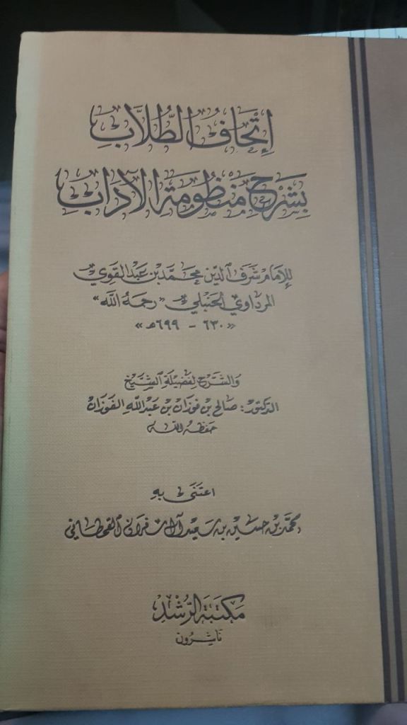 Due to the title of this book being شَرْح مَنْظُوْمَة الآدَاب, there was a bit of confusion as to which poem on Islamic Adāb was intended (some said it is an explanation to Ibn Muflih’s work, while others said al-Hajjāwi’s, and a third opinion states al-Mardāwi’s work). Shaykh Abdus-Salām ash-Shuway’ir mentioned that the correct opinion: it is an explanation for Ibn Abdul-Qawi’s poem.