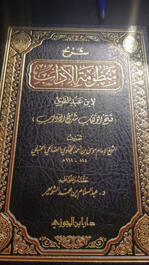 2. Sharaf-Deen Abu-Najā Musā b. Ahmad b. Musa al-Hajjāwi al-Maqdisi as-Sālihī al-Hanbali’s (968h) explanation entitled: فَتْح الوَهَّاب شَرْح الآدَاب or more famously known as شَرْح مَنْظُوْمَة الآدَاب.